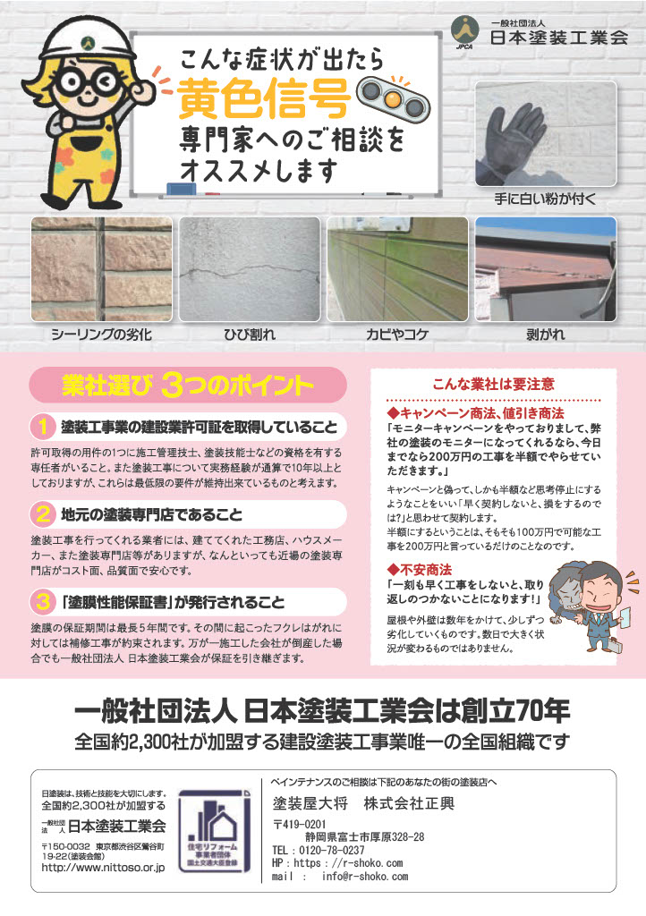 『塗装屋大将』は静岡県富士市に本社の(株)正興が運営しています。実績40年以上の(株)正興にお任せください。